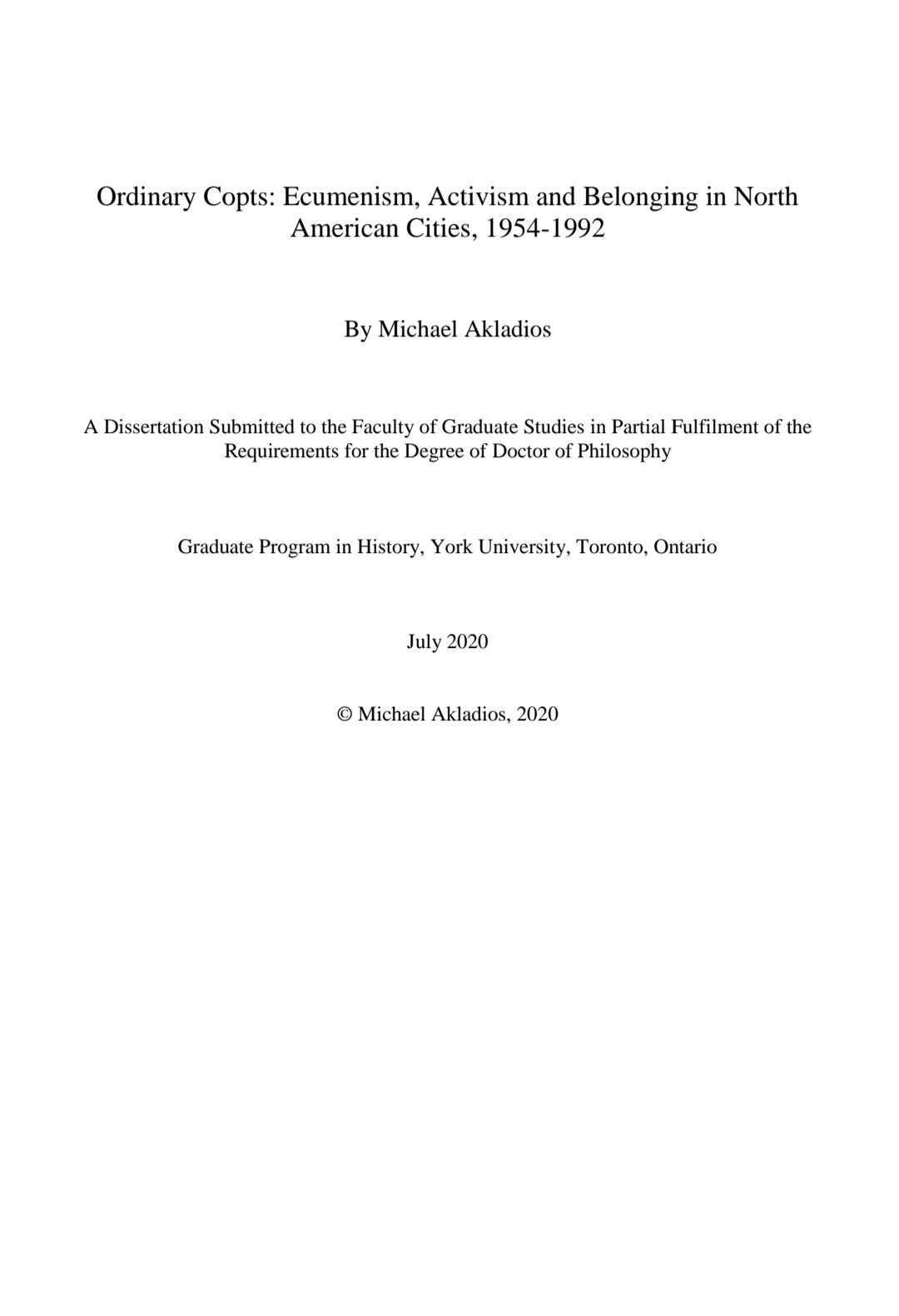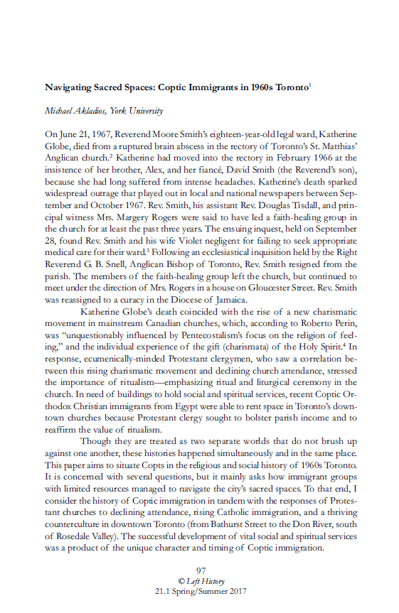 Under revision, the manuscript is tentatively titled Ordinary Copts: Ecumenism, Activism, and Belonging in North American Cities. This is a study of the departure, journey, settlement, and institutionalization of Coptic Orthodox Christians in an era of post-colonial nativism in Egypt and rising pluralism in Canada and the United States. The largest Christian minority in the Middle East, Copts are central to how we understand modern Egypt in a global perspective. As Egypt contended with anxieties occasioned by modernity and urbanization and grappled with issues surrounding independence, identity, and Islamic revival, a wave of antipathy toward any group considered ‘foreign’ or ‘other’ spread through society, prompting many to emigrate. Copts who settled in central Canada and the northeastern United States went on to promote a Christian universalism. To contest racialization as Middle Eastern immigrants, they insisted on their Christian heritage to show commonality with the dominant culture of their receiving society.