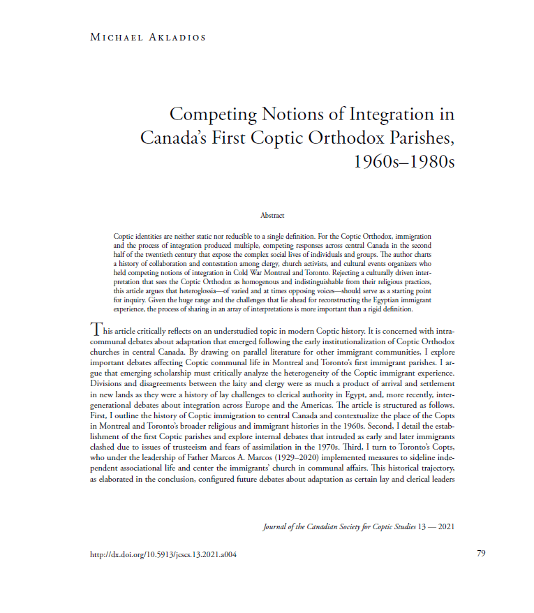 “Critical events and the formation of a Coptic diaspora in North America between Al-Khanka and Al-Zāwiya Al-Hamrā,” in Dalia Abdelhady and Ramy Aly eds., Routledge Handbook on Middle Eastern Diasporas (2022).