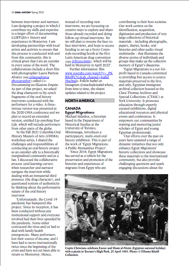 “Egypt Migrations,” International Works Section, Oral History Journal 50.1 (Spring 2022) 24-25 (report).